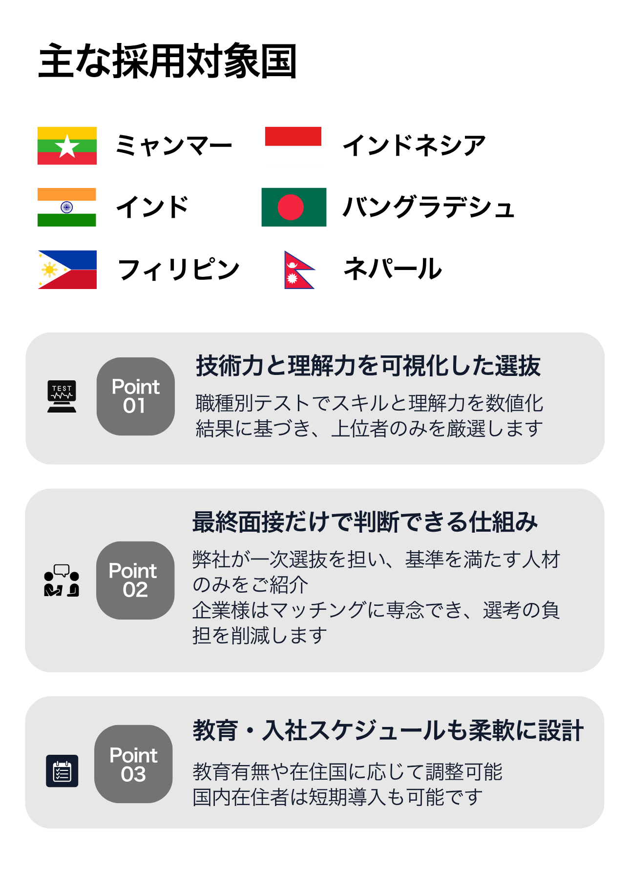独自プロセスで、国内外の優秀人材を届けます